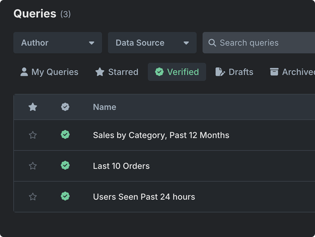 To serve both, we built integrated SQL verification: every saved query can be inspected, verified, and starred by technical users, then reused by everyone with confidence.