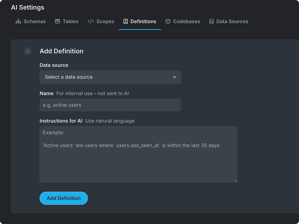 Visual: AI Settings → Definitions: select a Data source, give an internal name, and add natural-language instructions.