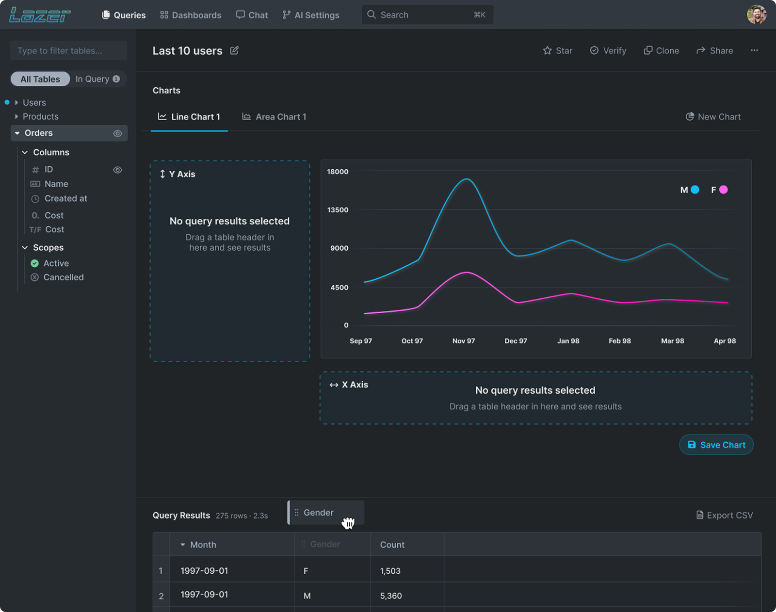 Lazer’s chart builder uses drag-and-drop headers so users can explore data visually without writing code. A collapsible panel keeps the workspace focused, while familiar controls (like line or area chart toggles) make customization fast and intuitive.