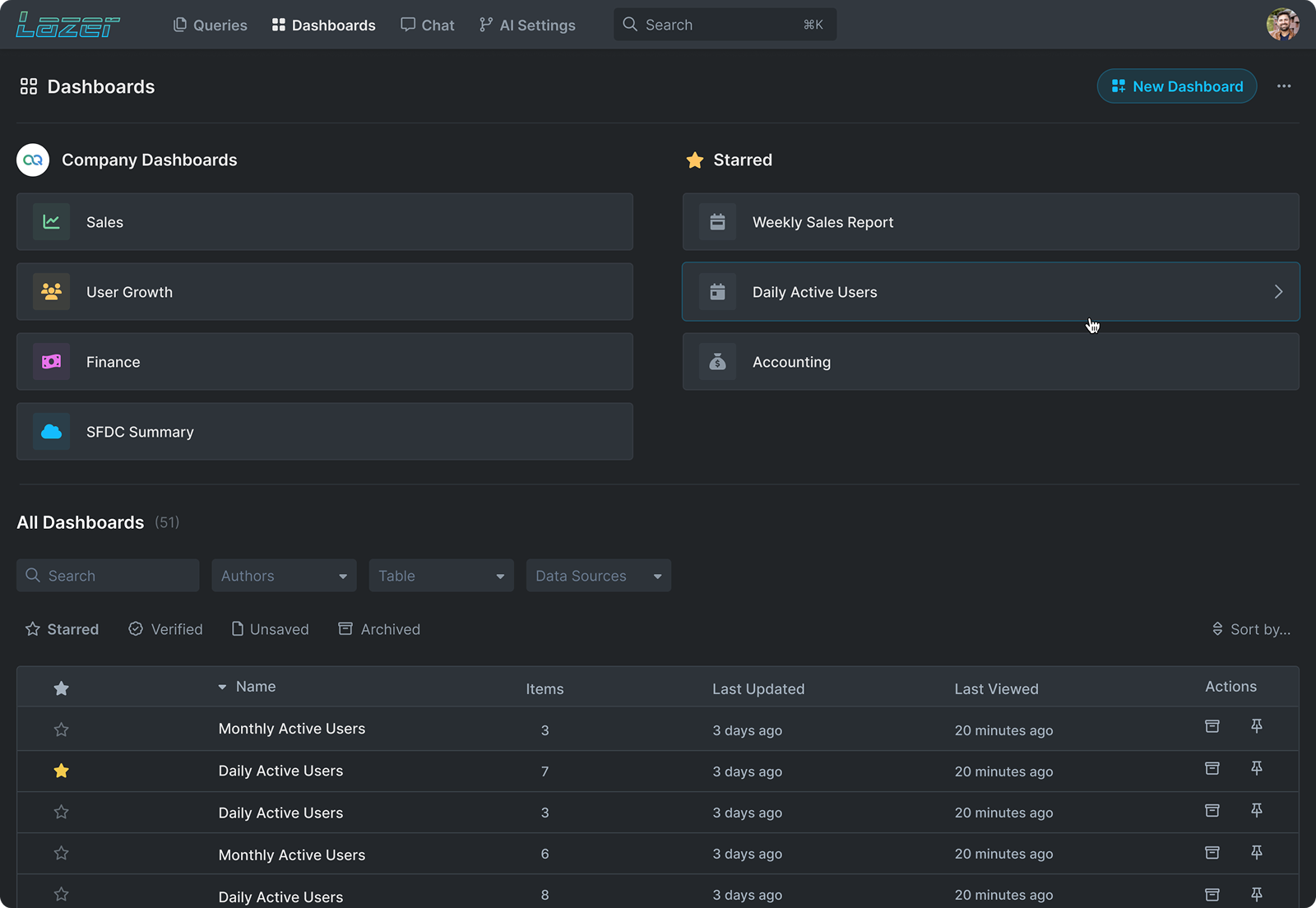 Users needed a faster way to find the dashboards they rely on, without digging through links. We built a top-level view that pulls together company dashboards, user-created dashboards, and starred favorites, with search, filters, quick actions, and editable colors/icons so each dashboard is instantly recognizable at a glance.