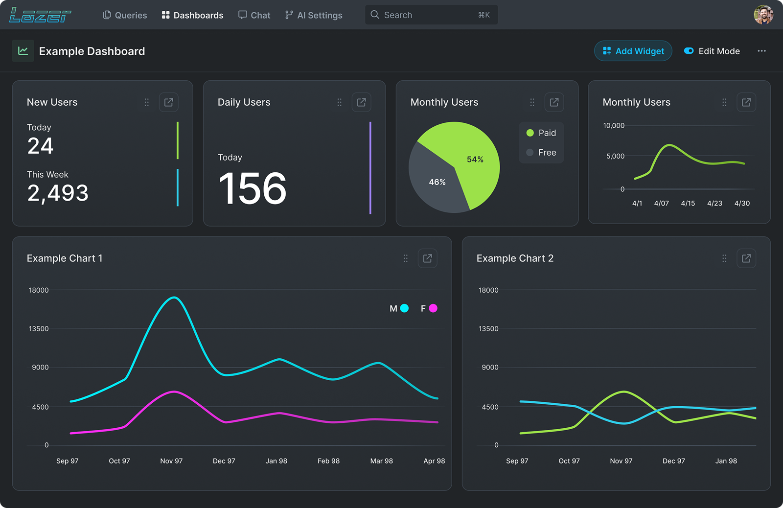 Users organize information differently, so dashboards shouldn’t be one-size-fits-all. Lazer lets you drag-and-drop widgets and resize cards to match your workflow, surfacing the metrics you care about and tucking the rest away. The result is a focused, personal workspace that keeps attention on what matters.